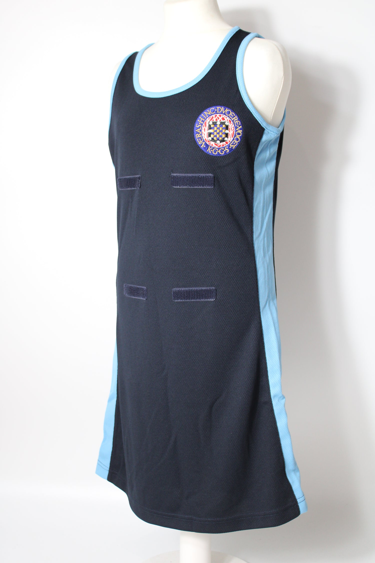 Navy & Sky Blue Netball Dress embroidered with the school logo.