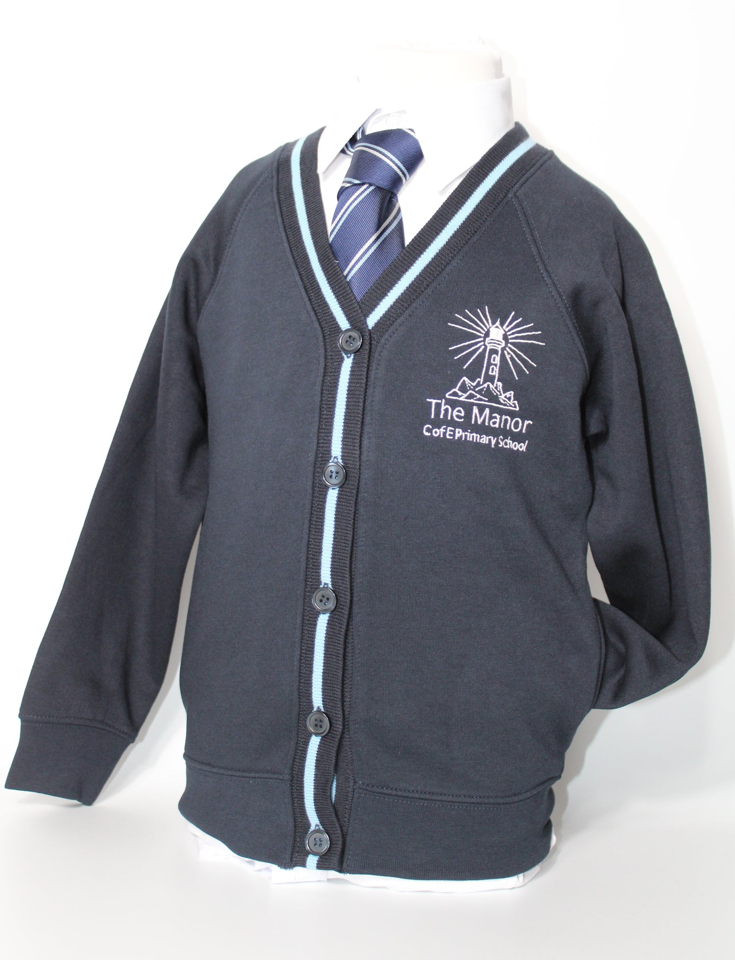 Navy & Sky Blue Cardigan with The Manor School Logo embroidered to the left chest.